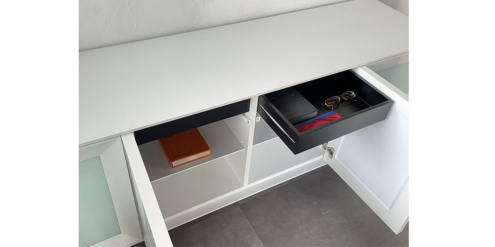 4枚の扉内には、それぞれ引出しトレイと棚板があるため、外見に反して利便性の高い構造になっています。