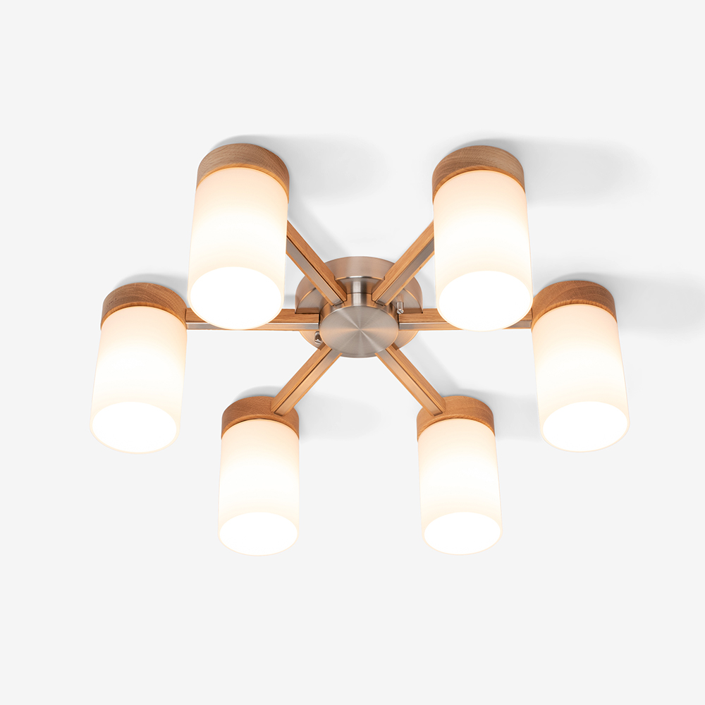 オーソドックスなデザインながら、オイル仕上げの無垢材と存在感のある金属パーツを組み合わせたデザインは、どの角度から見ても美しいシャンデリアです。