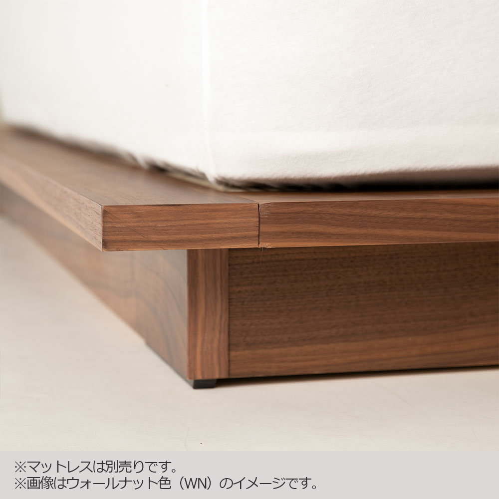 天然木の素材感が際立つシンプルでスタイリッシュなデザインです。床板面高14cmの低床フレームは圧迫感がなく空間が広々と感じられます。※マットレスは別売りです。画像はウォールナット(WN)色、ダブルサイズのイメージです。
