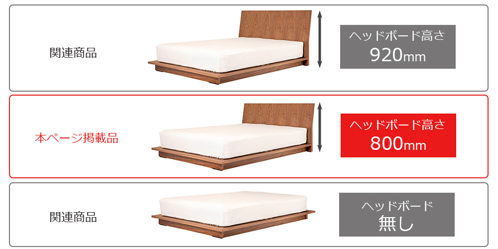 「グランドヴェール」シリーズはヘッドボード高さ2サイズ(92cm・80cm)と、ヘッドボード無しの全3タイプのご用意があり、腰窓などが気になるお部屋でもレイアウトの幅が広がります。 本ページ掲載商品はヘッドボード高さ80cmタイプとなります。高さ92cmタイプ、ヘッドボード無しタイプをご希望の場合は、下部の「関連する商品はこちら」欄よりご覧いただけます。