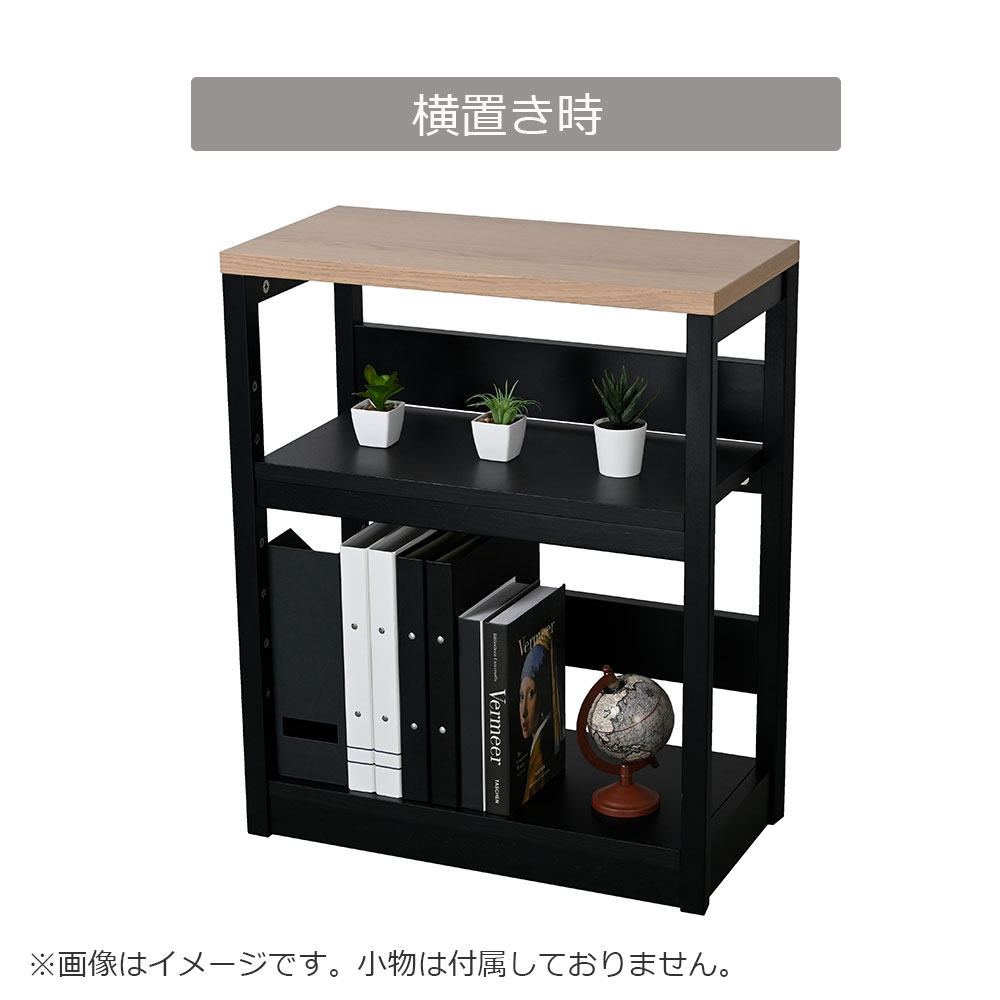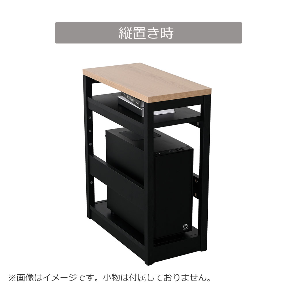 サイドラックの棚と背板2枚は組み替えることができ、「横置き」でシェルフとして、「縦置き」にしてパソコンの本体を収納したりと、用途に応じて使用できます。