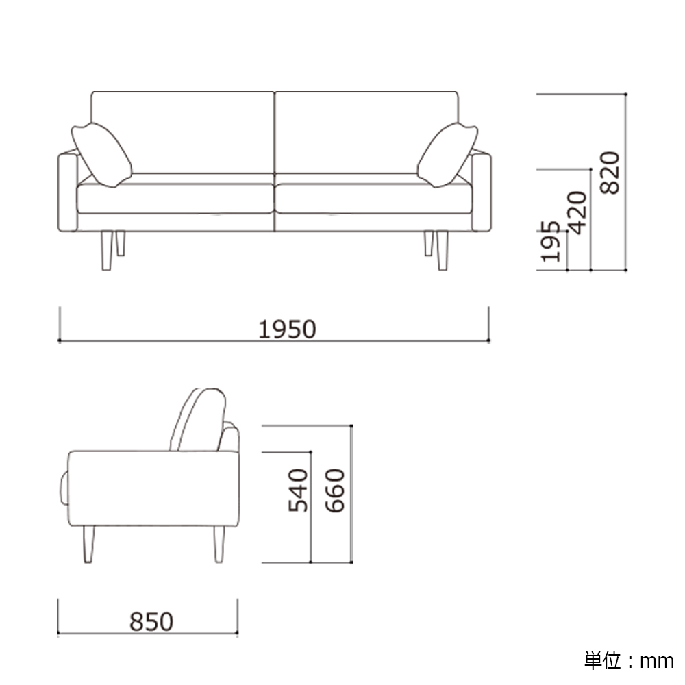 高さのあるスタイリッシュな脚部と、薄めに仕上げた座面が絶妙なバランス。どの方向から眺めてもスッキリとした印象のフォルムが特徴的なソファです。
