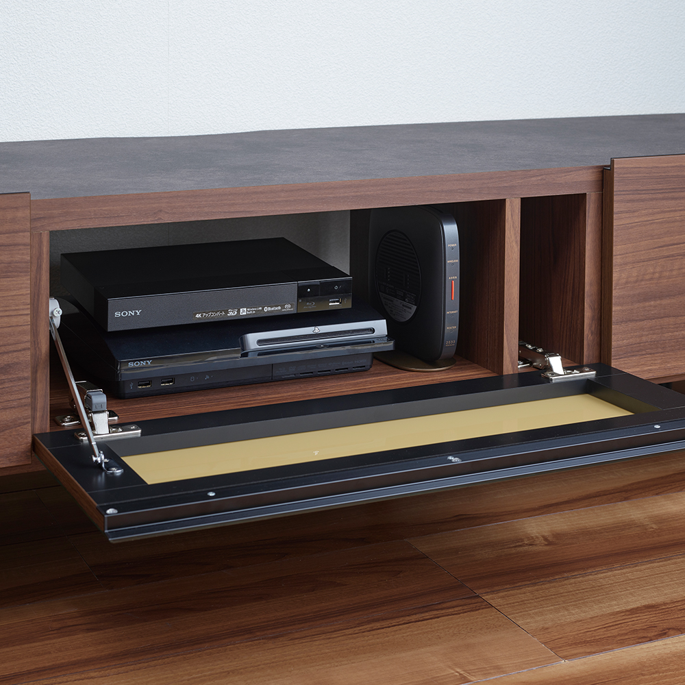 AV機器収納部のフラップ扉は引出しと同じ表面材を貼ったガラス製です。扉を閉めたままでもリモコン操作を行うことができます。