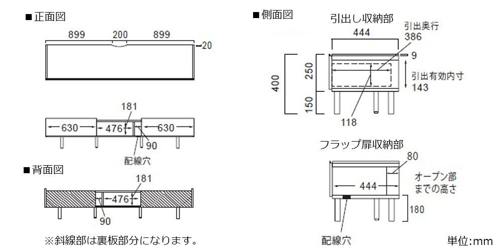 背面がオープン仕様となっているため壁面のコンセントがそのまま使用できます。右側のフリースペース底面には配線孔もあります。