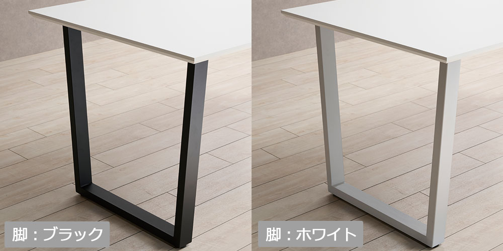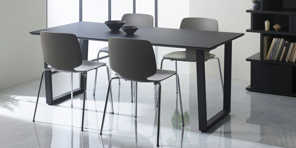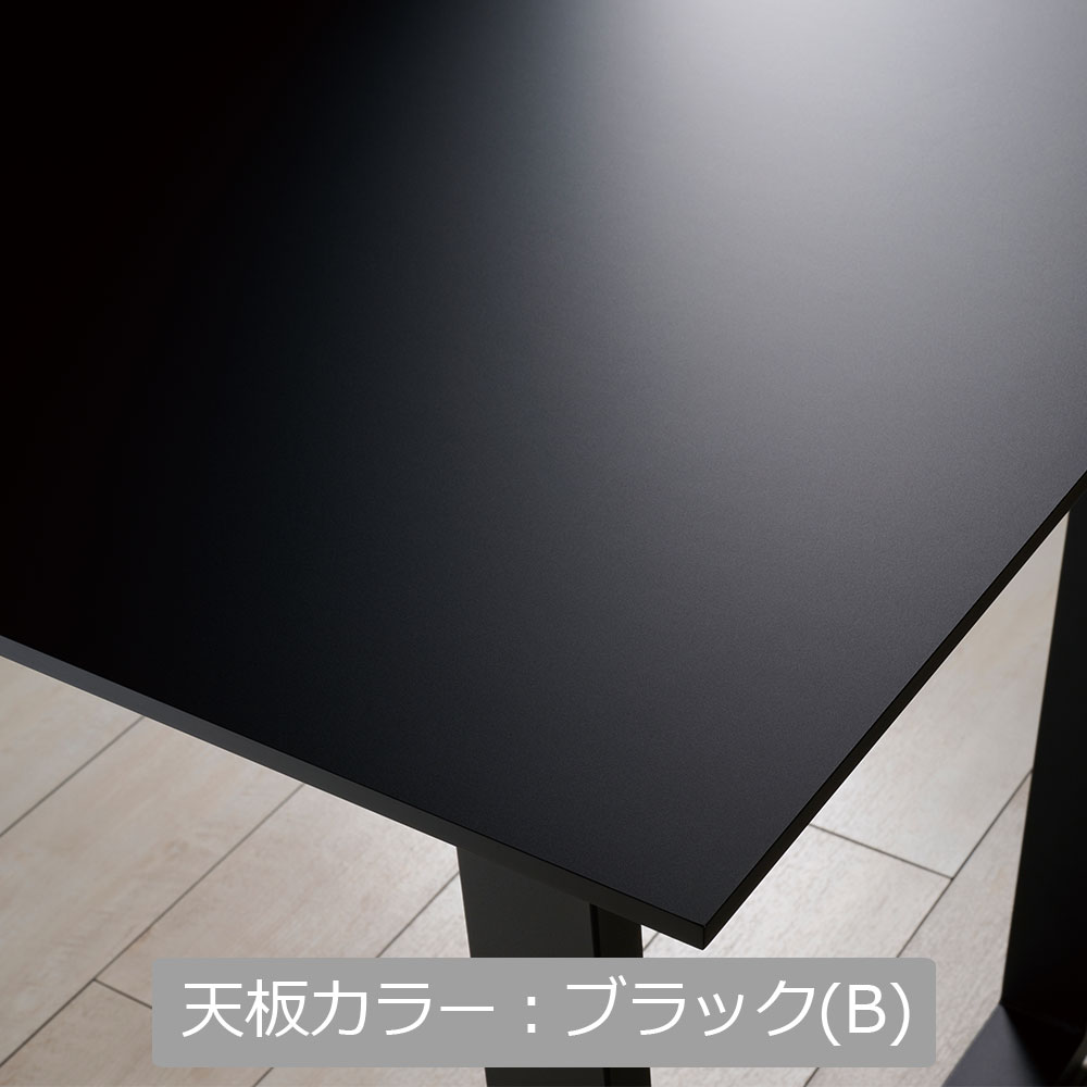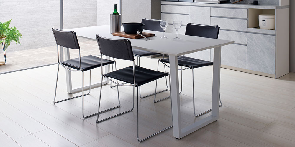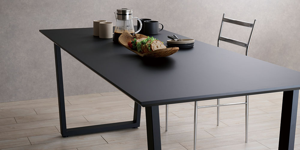 お部屋のインテリアに合わせて4色の天板、2色の脚から組み合わせ可能です。落ち着いたカラー展開でおしゃれなダイニングルームを演出します。※画像は天板ブラック(幅180cm・奥行80cm)/脚ブラックのイメージです。