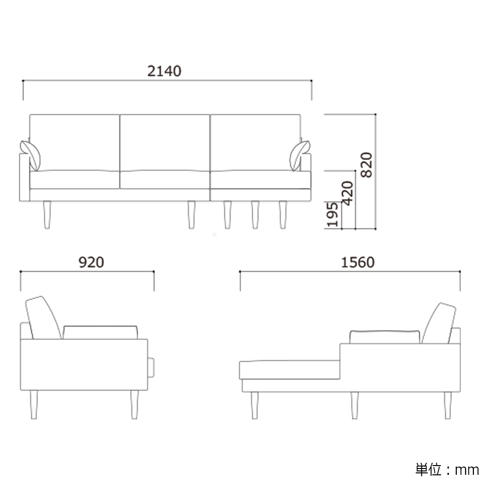 高さのあるスタイリッシュな脚部と、薄めに仕上げた座面が絶妙なバランス。どの方向から眺めてもスッキリとした印象のフォルムが特徴的なカウチソファです。