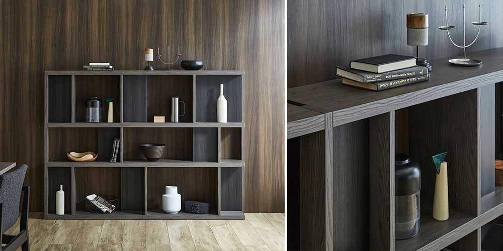 木目調の本体にブラックのアクセントがおしゃれなシェルフです。表裏の奥行を変化させることで、飾るように収納することができます。両面を余すことなく使え、間仕切りとしてもおすすめです。ハイタイプはほどよく視線を遮り、空間を分けてくれます。