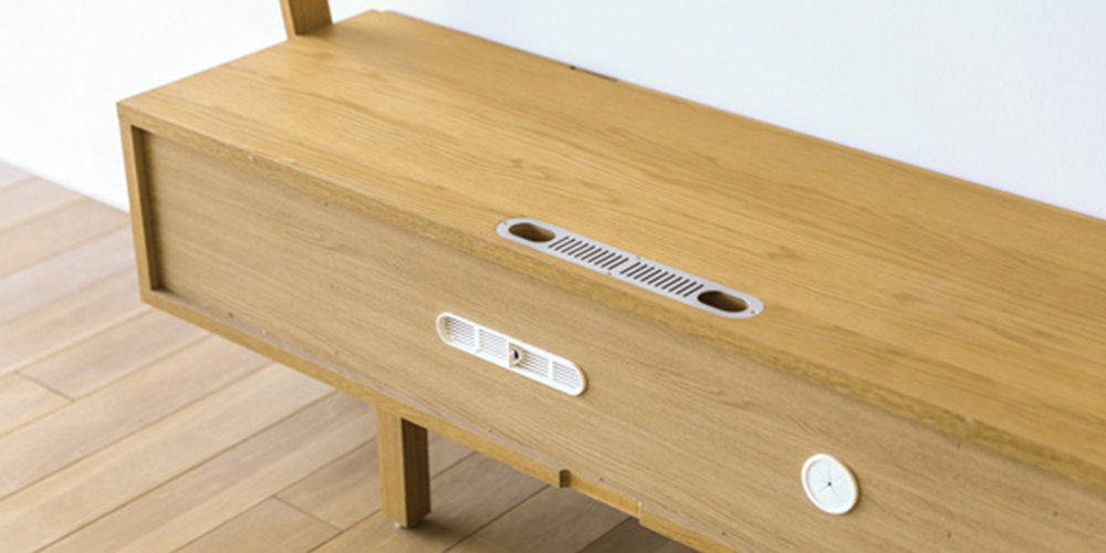 背面にはプリント化粧板を使用。天板中央後部 と背面にそれぞれコード兼空気孔を設けました。デッキ内にこもりがちな機器から発する熱を外に逃がす効果もあります。※画像はホワイトオーク材です。