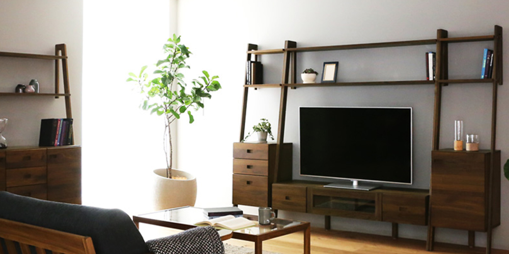 見せる収納と隠す収納を、自在に使い分けられるレイリアシリーズ。上部のラックには、お気に入りの雑貨や小物、グリーンを飾るディスプレイ収納を楽しめます。「見せる」と「隠す」を お好みで使い分けて、理想のインテリアをお楽しみください。