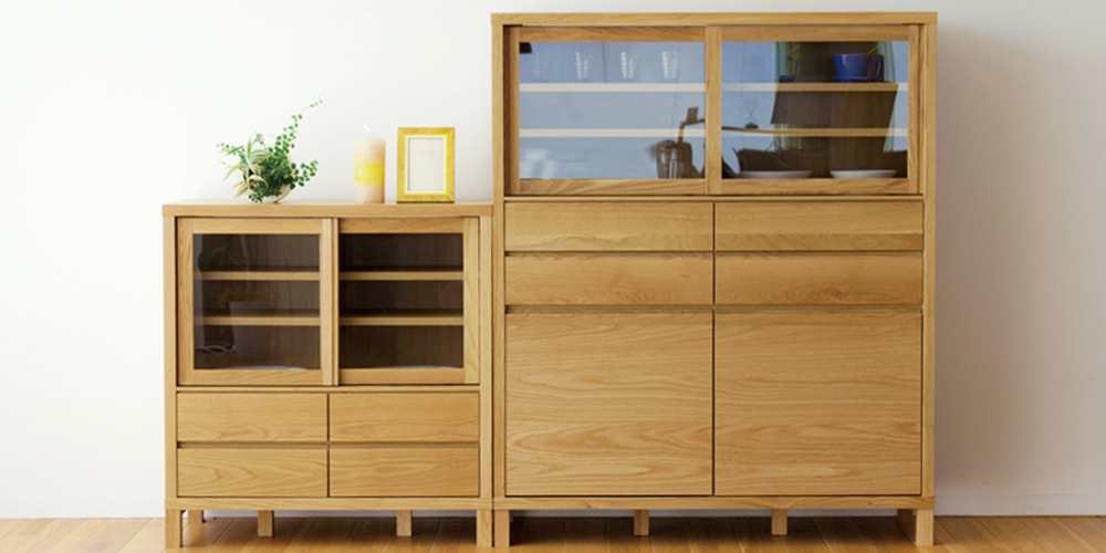 無垢材の重厚で上品な質感。キッチンやダイニングスペースはもちろん、リビングにも置けるシャープでモダンなミドルサイズのカップボードです。