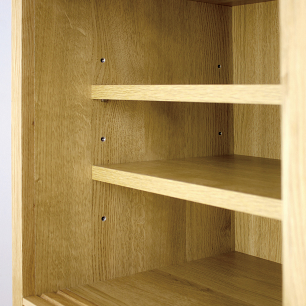 ガラス扉内には6cmピッチの5段階で高さ調節可能な移動棚が4枚付属します。高さのあるワイングラスなどの食器にも対応します。