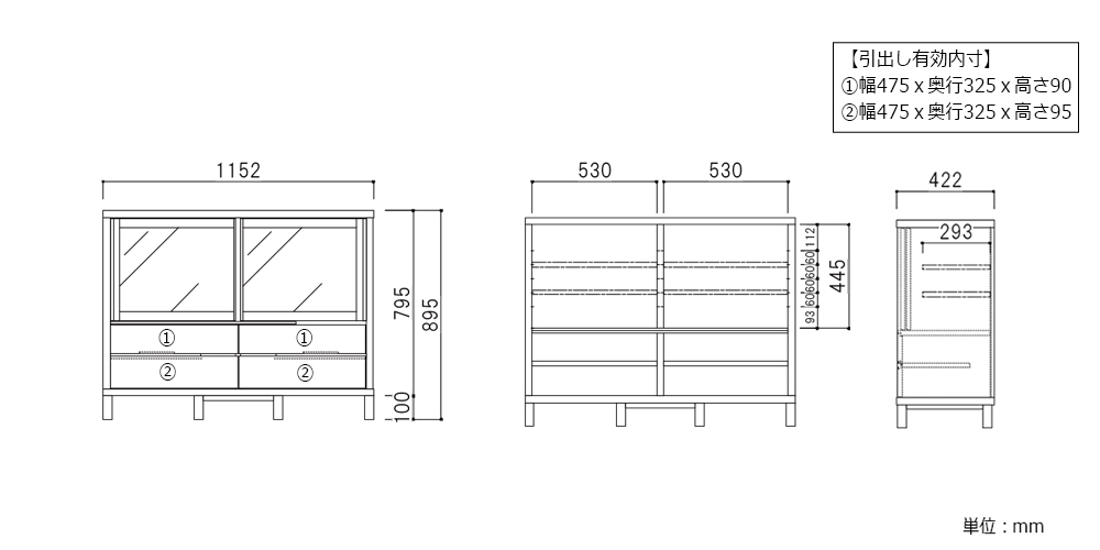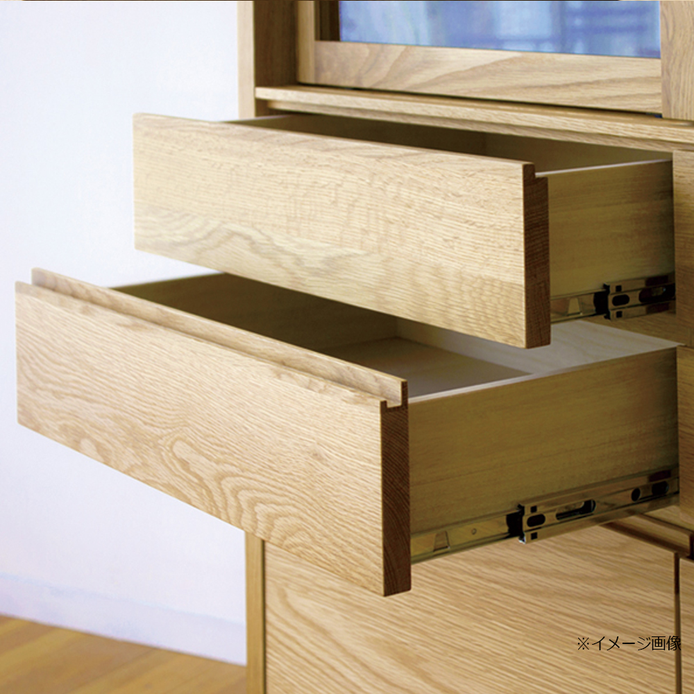 引出しにはフルオープンスライドレールを装備。スムーズに開閉できる引出しは浅めの作りで、スプーンやフォークなどのカトラリー類もまとめやすい仕様です。
