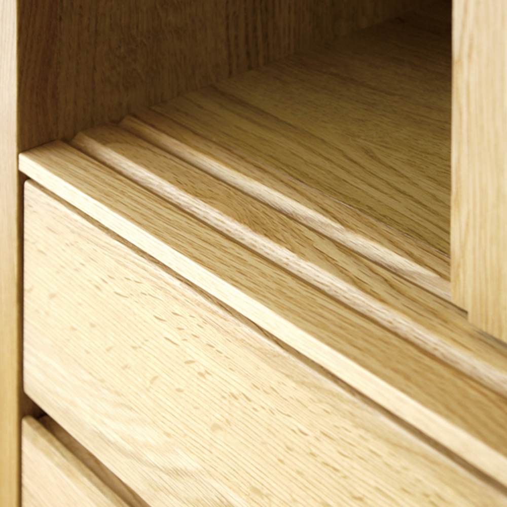 レール部分には金属部を使用せず、天然木無垢材を使用することで細部にまで木のぬくもりを味わうことができます。扉は引き戸仕様で開閉も滑らかです。