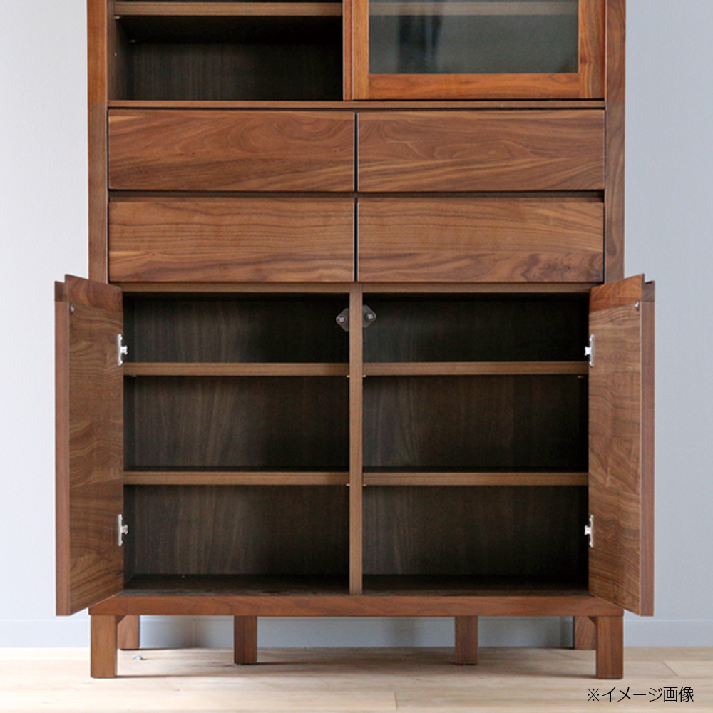無垢材の重厚で上品な質感。キッチンやダイニングスペースはもちろん、リビングにも置けるシャープでモダンなミドルサイズのカップボードです。