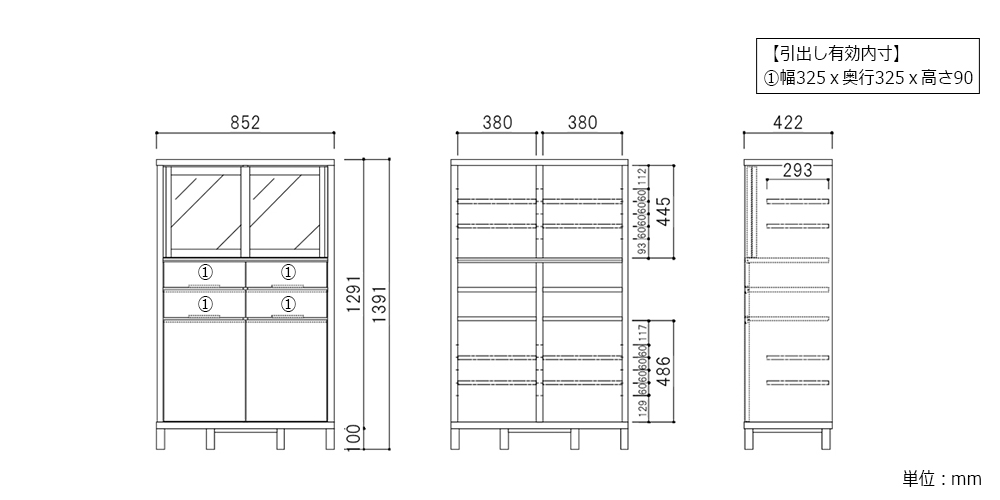 引出しにはフルオープンスライドレールを装備。スムーズに開閉できる引出しは浅めの作りで、スプーンやフォークなどのカトラリー類もまとめやすい仕様です。