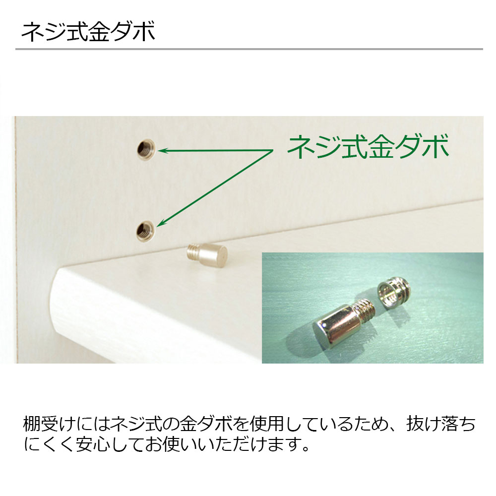 棚受けにはネジ式の金ダボを使用しているため、抜け落ちにくく安心です。オプション引き出し(別売り)も、しっかりと支えます。