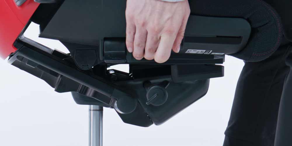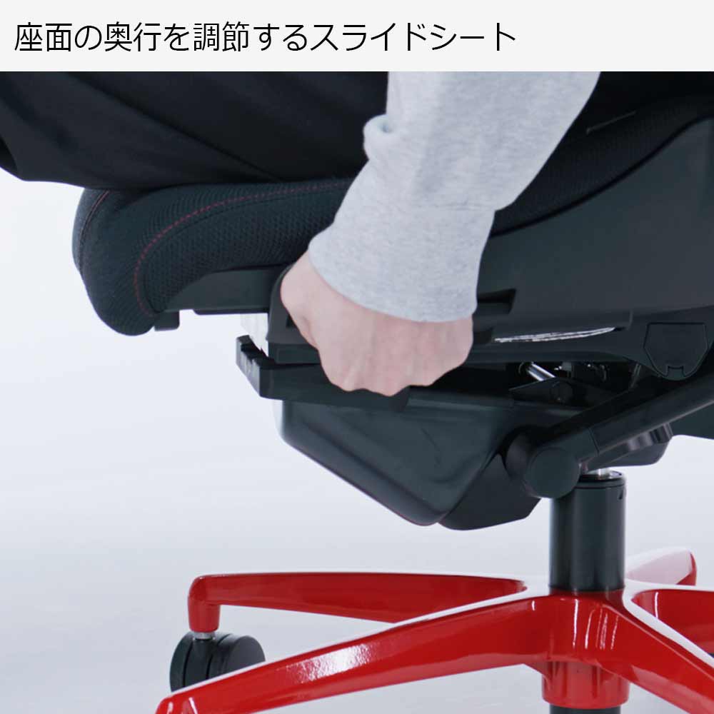 座面の先端部分を内側に巻き込み、奥行を調整することで太ももの圧迫を解消。長時間の着座姿勢で起こりやすい血流の悪化を防ぎます。また、小柄な体形の方の悩みとなっている深く腰掛けられない、脚が届かないといったストレスを軽減します。