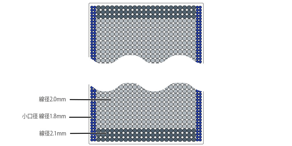 型崩れしやすいマットレス外周には太線経や小口径のポケットコイルを配置。マットレスの耐久性を高めるとともに縁の落ち込みを抑え、マットレス全面を快適に使えるよう設計しています。※画像はイメージイラストです。