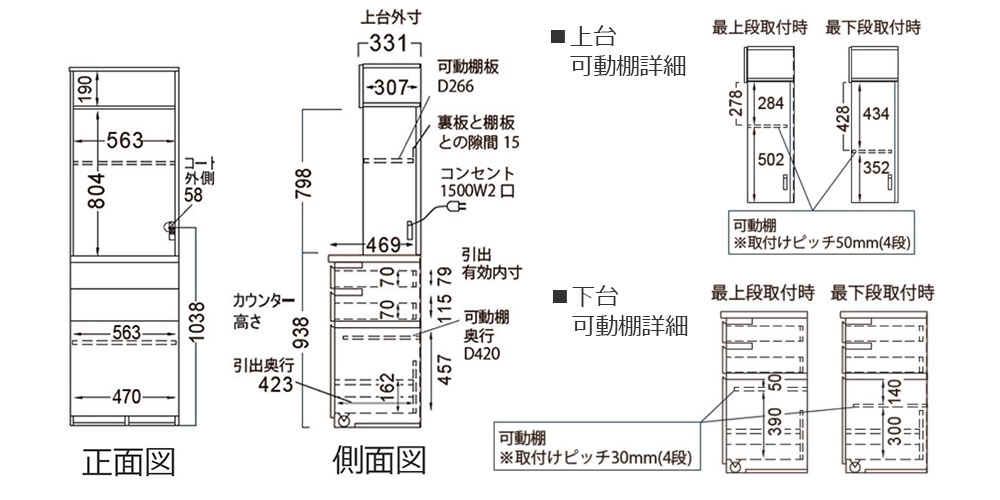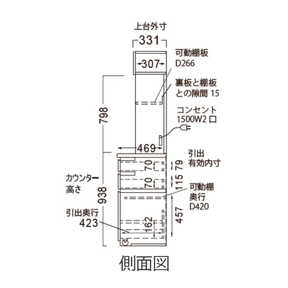 ※点線部:可動棚板、引出し※図面に記載されている商品高さは、商品底部の三角座が含まれていません。実際の高さは表記の3mmになります。