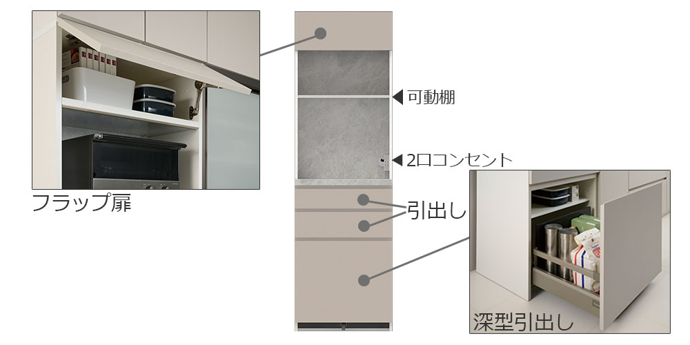 高級感のあるデザインと高い機能性を兼ね備えた食器棚シリーズ「CP」のサイドアイテムです。家電収納に便利なオープンスペースと3段引出しでたっぷり収納できます。上部はフラップ扉収納です。CPシリーズのオープンボードやカウンターと並べることで、キッチンのスペースに合わせたレイアウトが可能です。※画像はハイマットベージュ色のイメージです。