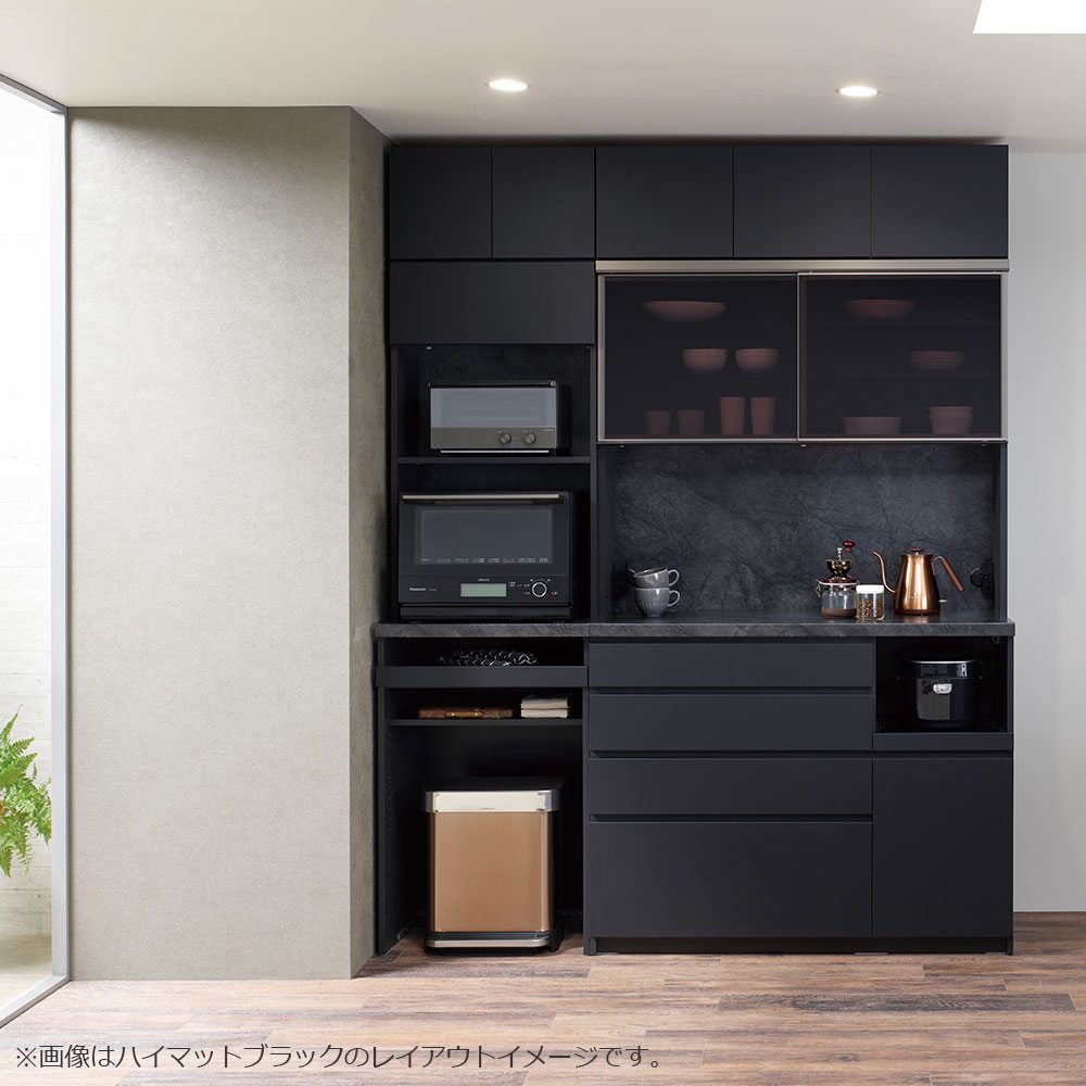 高級感のあるデザインと高い機能性を兼ね備えた食器棚シリーズ「CP」のサイドアイテムです。上台は家電、下台はダストボックスなどの収納スペースとしてお使いいただけるオープンタイプです。上部はフラップ扉になっています。CPシリーズのオープンボードやカウンターと並べることで、キッチンのスペースに合わせたレイアウトが可能です。スリムな奥行44.5cmタイプです。※画像はイメージです。