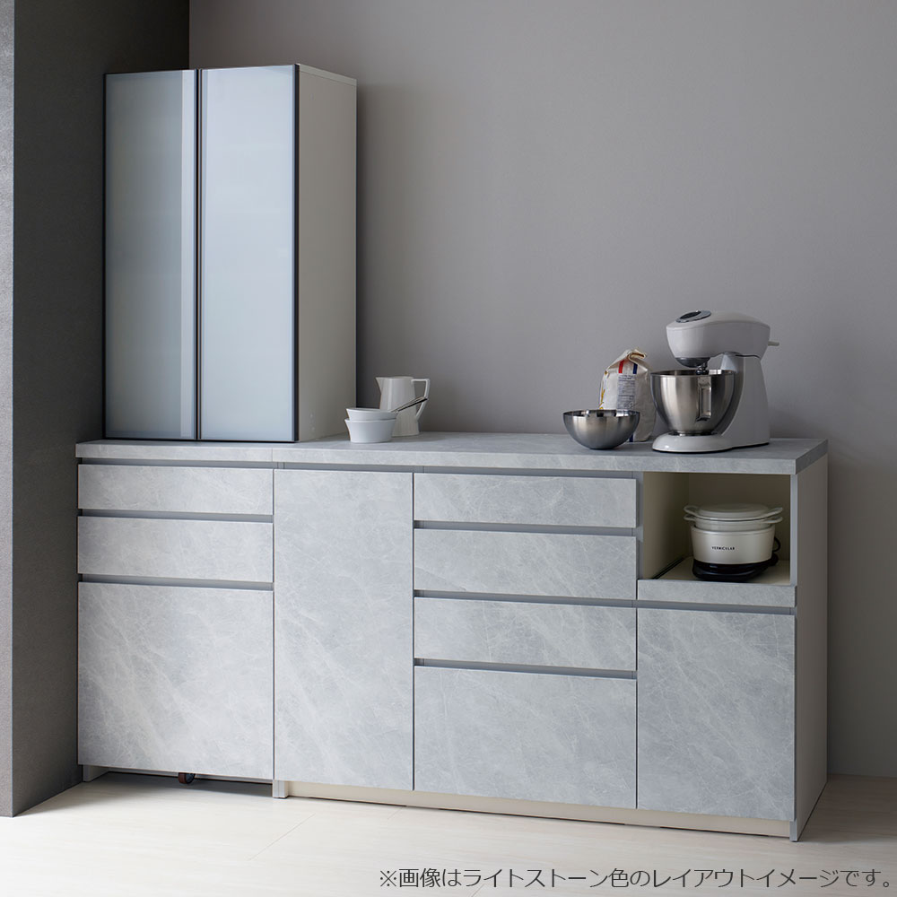 明るく、清潔感のある印象に加え、上品な石目柄が魅力的なライトストーン色。画像の組み合わせ:CPA-S600K、CPA-S1400R、CP-VH60U(上置き)、CP-VH140U(上置き)※画像はカラーをお伝えする為のCPシリーズのイメージです。上置きはオンラインショップには掲載しておりません。ご希望の際はお手数ですがお問い合わせください。