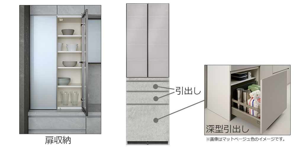天板は、ブラックストーン色・ハイマットブラック色をお選びいただくとブラックストーン色になり、ライトストーン色・ハイマットベージュ色をお選びいただくとライトストーン色になります。※画像は天板カラーのイメージです。