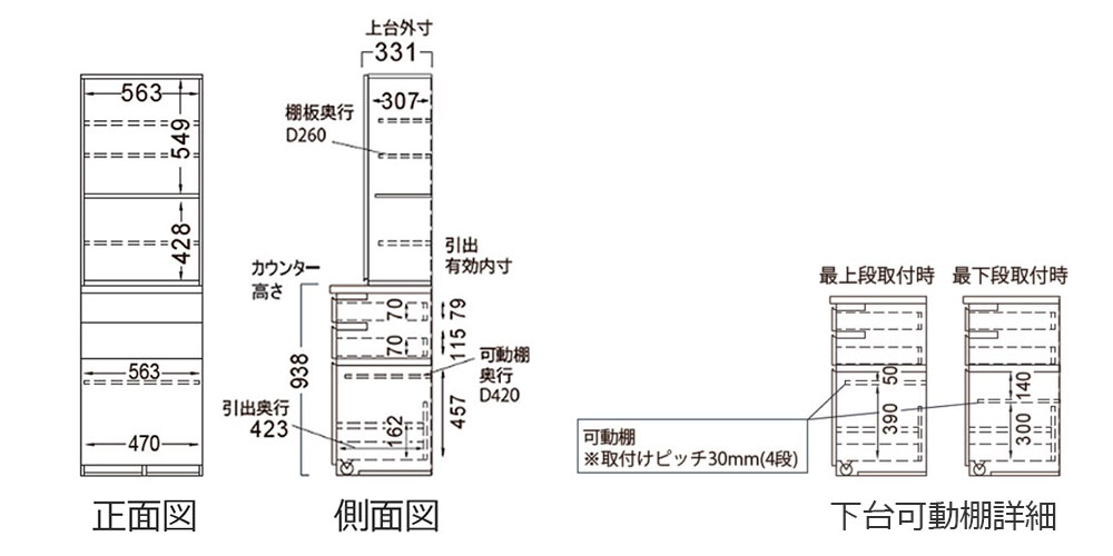 ※点線部:可動棚板、引出し※図面に記載されている商品高さは、商品底部の三角座が含まれていません。実際の高さは表記の3mmになります。