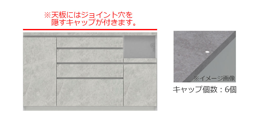 オープンボードの下台のみをカウンターとしてお使いいただく仕様です。そのため、天板には上台とのジョイント穴を隠す樹脂製のキャップが6箇所付きます。ブラックストーン色とハイマットブラックにはブラック、ライトストーン色とハイマットベージュ色にはホワイトのキャップが付属します。予めご了承ください。※画像はイメージです。