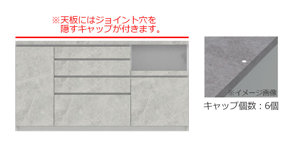 オープンボードの下台のみをカウンターとしてお使いいただく仕様です。そのため、天板には上台とのジョイント穴を隠す樹脂製のキャップが6箇所付きます。ブラックストーン色とハイマットブラックにはブラック、ライトストーン色とハイマットベージュ色にはホワイトのキャップが付属します。予めご了承ください。※画像はイメージです。