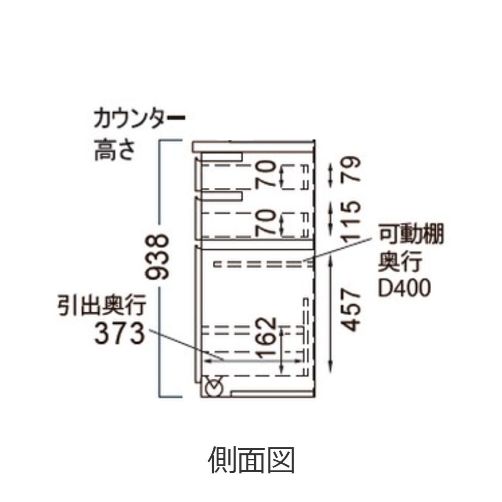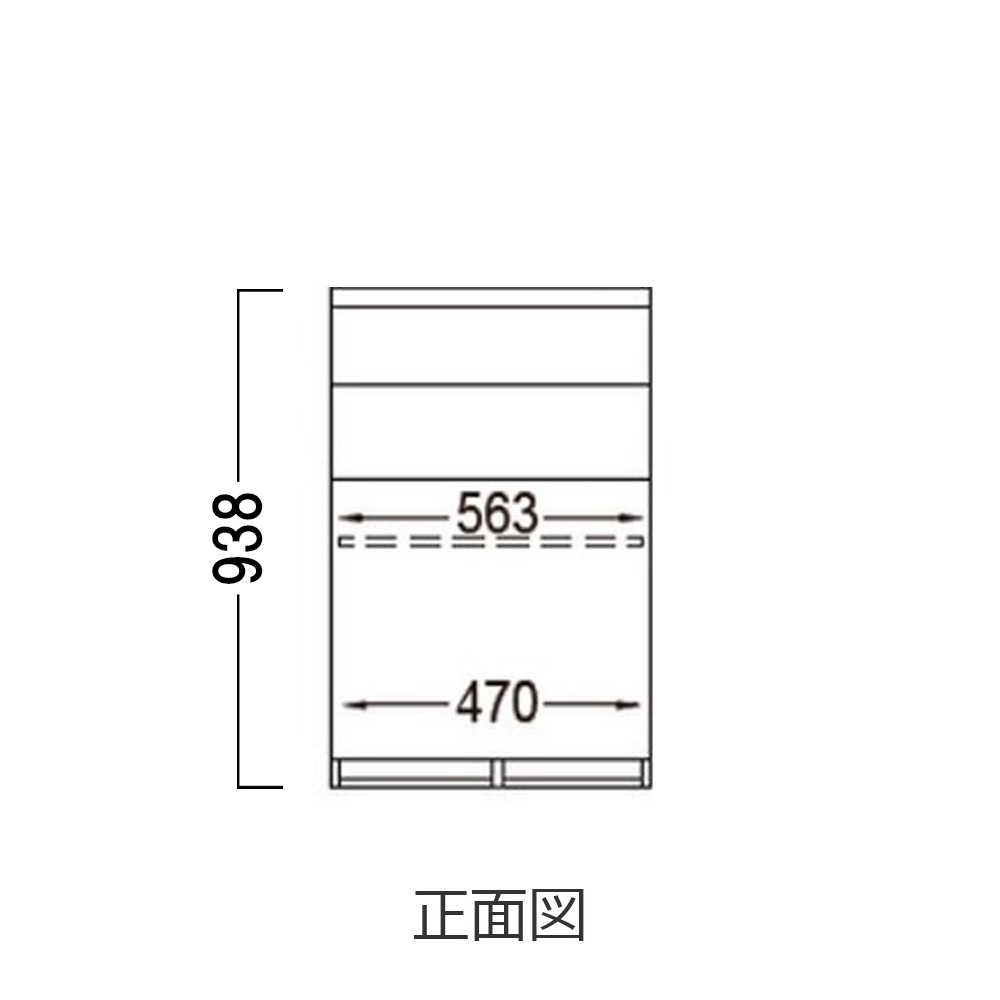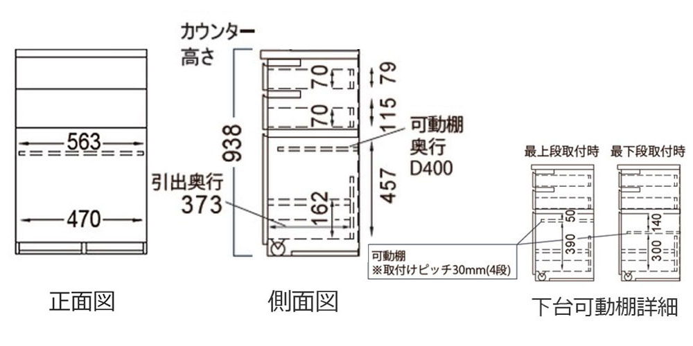 ※点線部:可動棚板、引出し※図面に記載されている商品高さは、商品底部の三角座が含まれていません。実際の高さは表記の3mmになります。