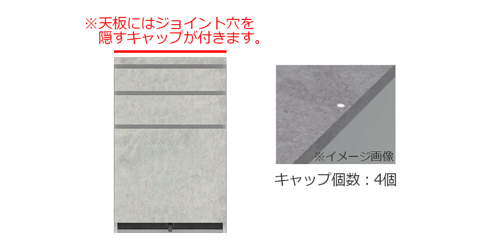 オープンボードの下台のみをカウンターとしてお使いいただく仕様です。そのため、天板には上台とのジョイント穴を隠す樹脂製のキャップが4箇所付きます。ブラックストーン色とハイマットブラックにはブラック、ライトストーン色とハイマットベージュ色にはホワイトのキャップが付属します。予めご了承ください。※画像はイメージです。