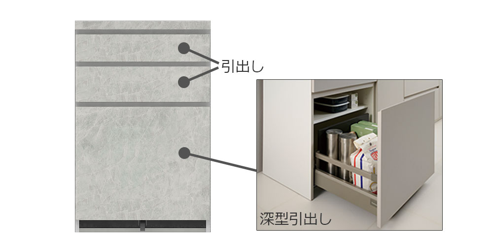 高さのあるものを収納するのに便利な可動棚付きの深型引出し。パモウナ「オプションダストボックス」の15Lタイプの場合は2個、26.5Lタイプの場合は2個収納可能です。ダストボックスを収納した場合は棚板が付けられなくなります。※ダストボックスは別売りです。※画像はイメージです。