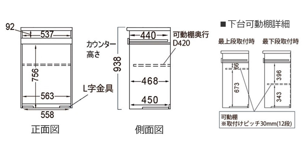 設置するものに合わせて高さを調節できる可動棚付きの下台オープンスペース。パモウナ「オプションダストボックス」は15L・26.5L・20L・40Lいずれのタイプも2個収納可能です。※ダストボックスは別売りです。15Lタイプと26.5Lタイプのダストボックスを収納した場合は棚板が付けられなくなります。