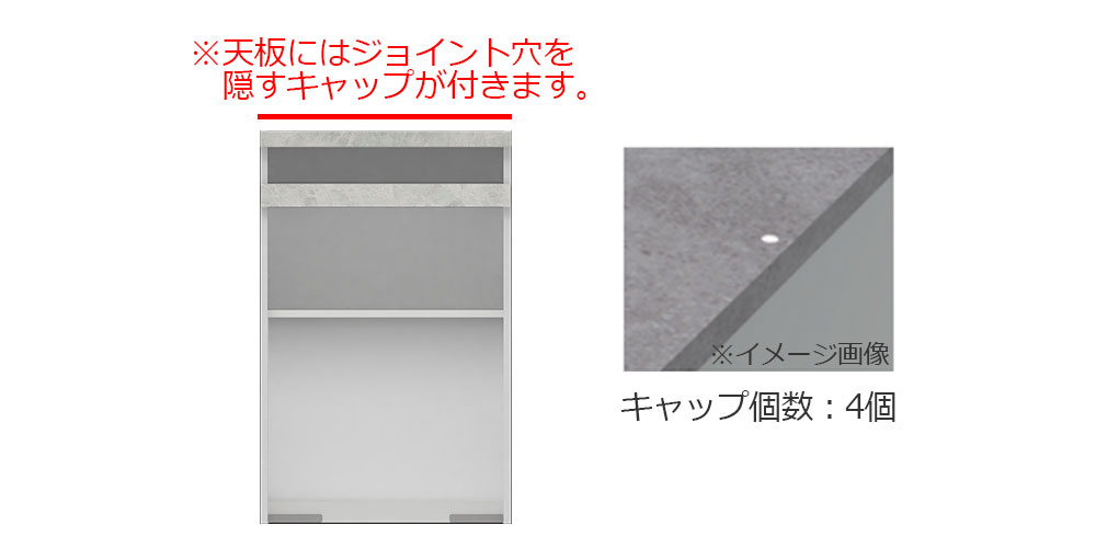 オープンボードの下台のみをカウンターとしてお使いいただく仕様です。そのため、天板には上台とのジョイント穴を隠す樹脂製のキャップが4箇所付きます。ブラックストーン色とハイマットブラックにはブラック、ライトストーン色とハイマットベージュ色にはホワイトのキャップが付属します。予めご了承ください。※画像はイメージです。