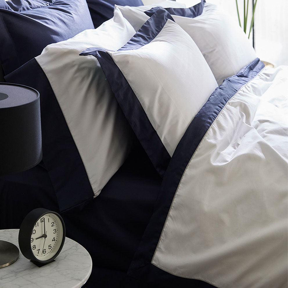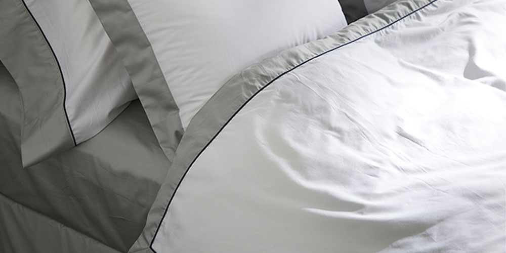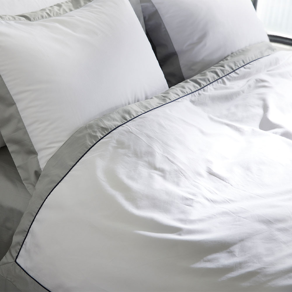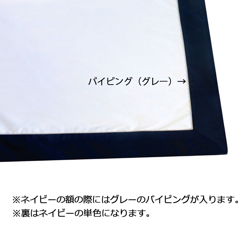 グレーにはネイビーのパイピング、ネイビーにはグレーのパイピングが入っているので、同色でのコーディネートはもちろん、2色を組み合わせてのコーディネートもおすすめです。※画像は掛け布団カバー・まくらカバー・ボックスシーツ(全てグレー色)のコーディネートイメージです。