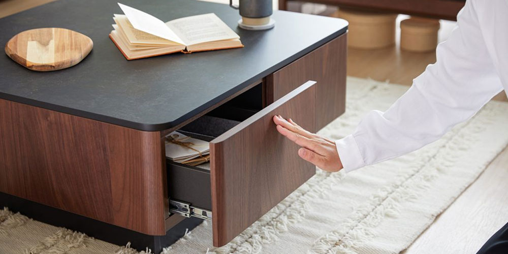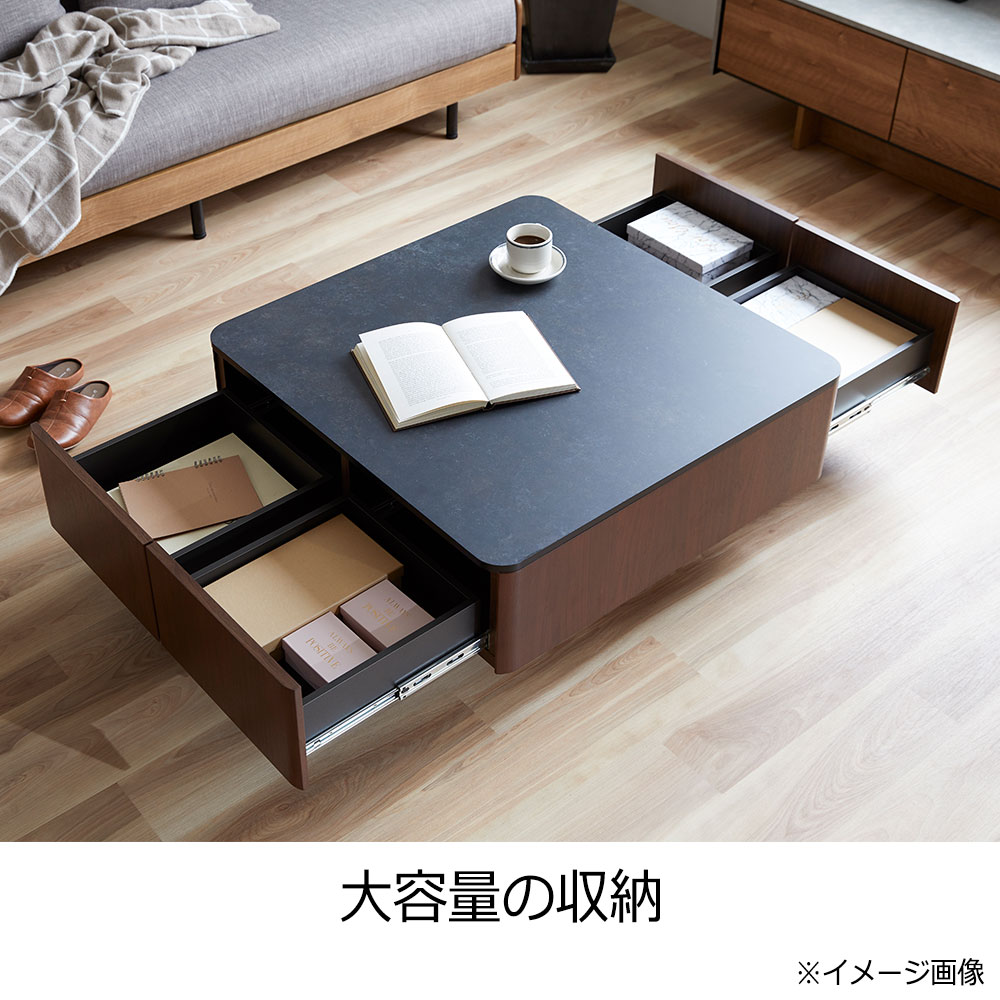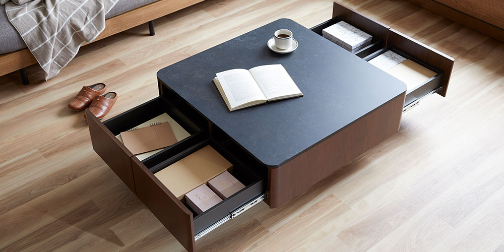 大容量の引出しを備えています。生活感が出やすいアイテムを収納し、空間をオシャレに演出します。リビング空間の中心にあるセンターテーブルに、よく使用する小物を収納することでストレス無く出し入れすることができます。
