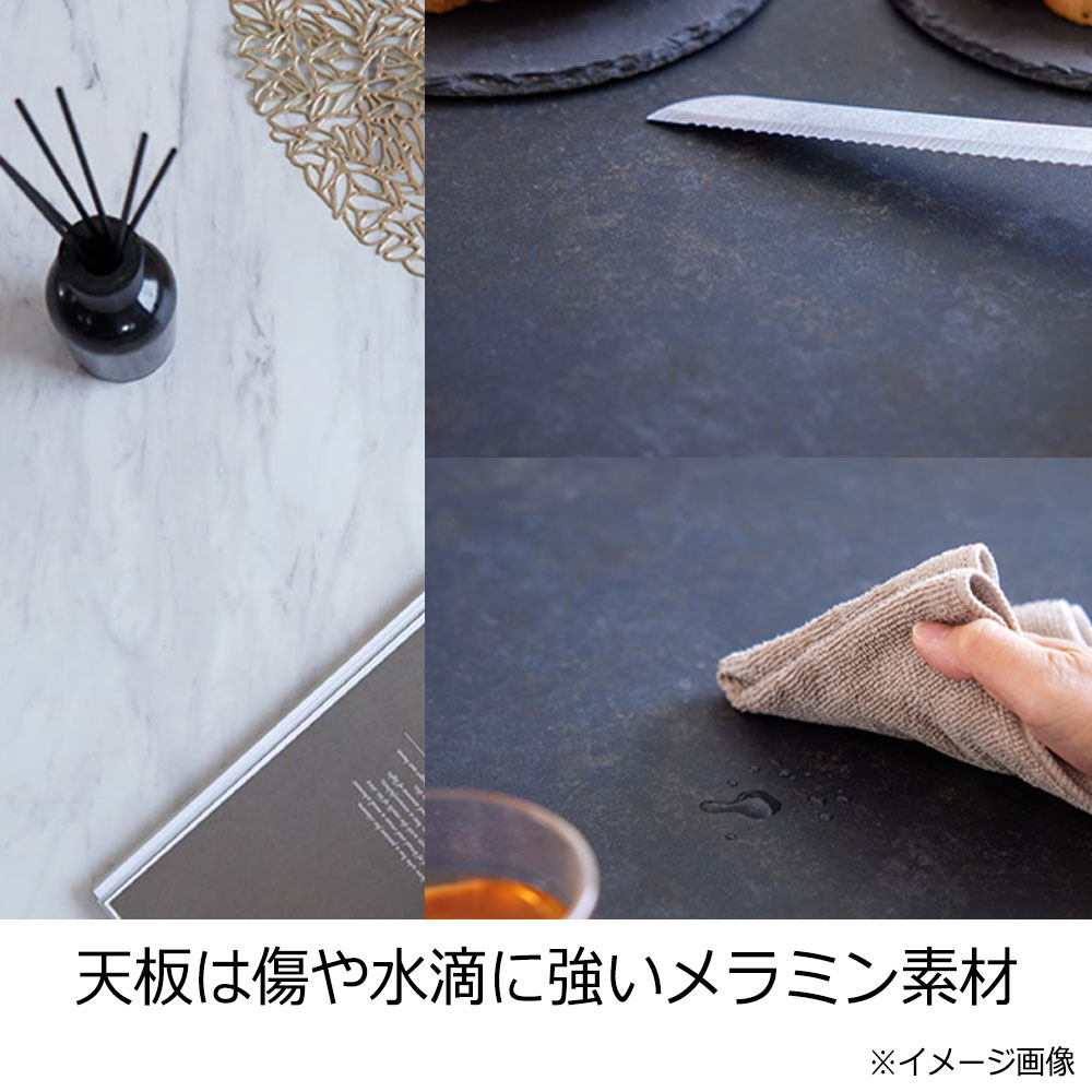 テーブルの角は丸みをつけて、優しい印象に仕上げました。 小さなお子様やペットを飼っているご家庭でも安心してご使用いただけます。胴回りには贅沢に天然木の突板を使用しています。天板のメラミンとの異素材ミックスが高級感ある空間を演出します。