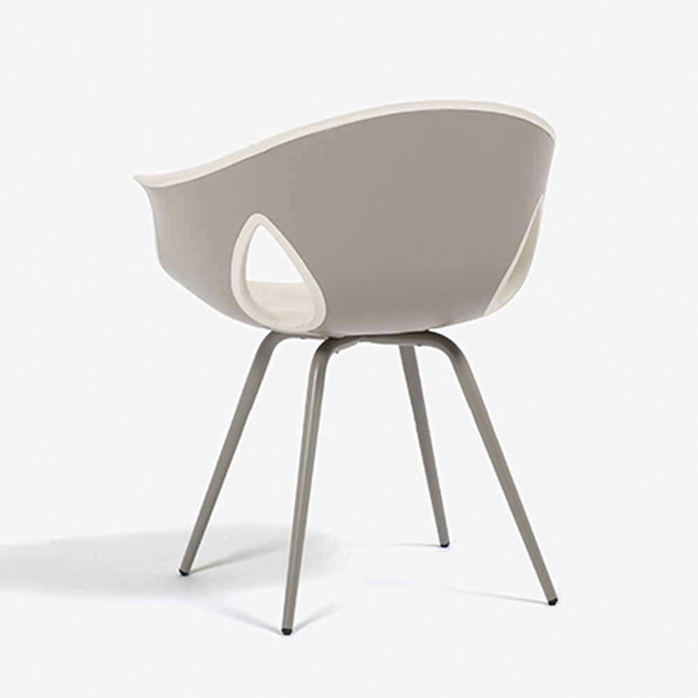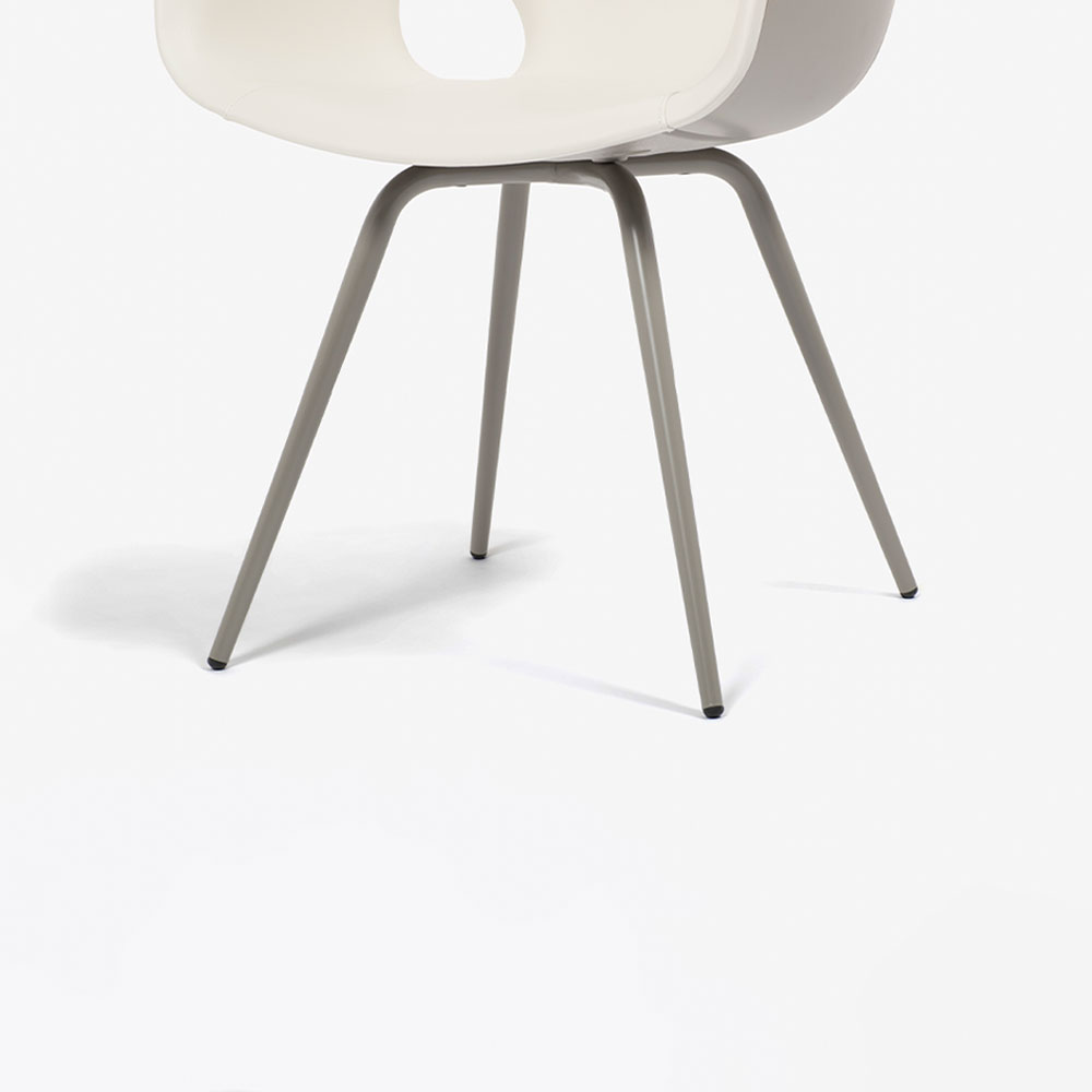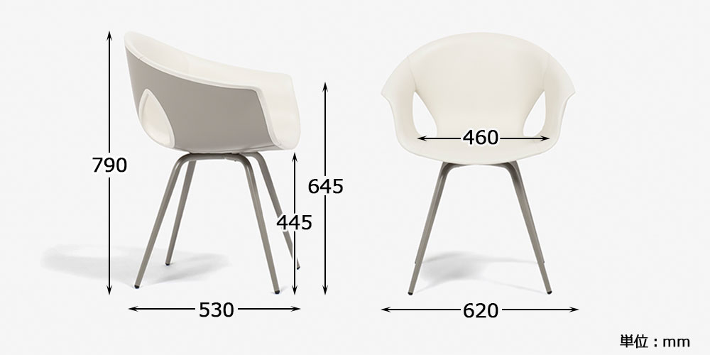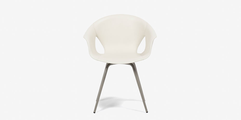 柔らかなラインとグラフィック感あふれるシェル型のフレーム、円錐形の脚部が視覚的に統一感をもたらします。