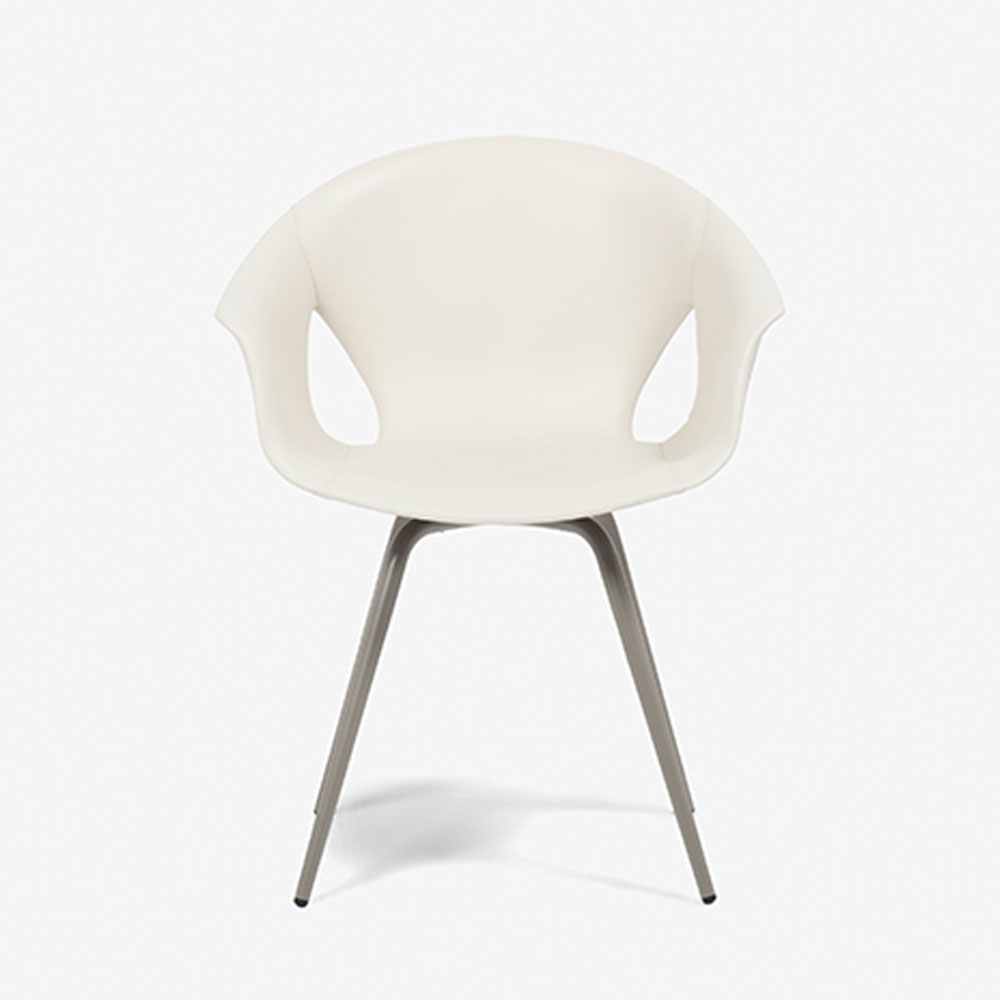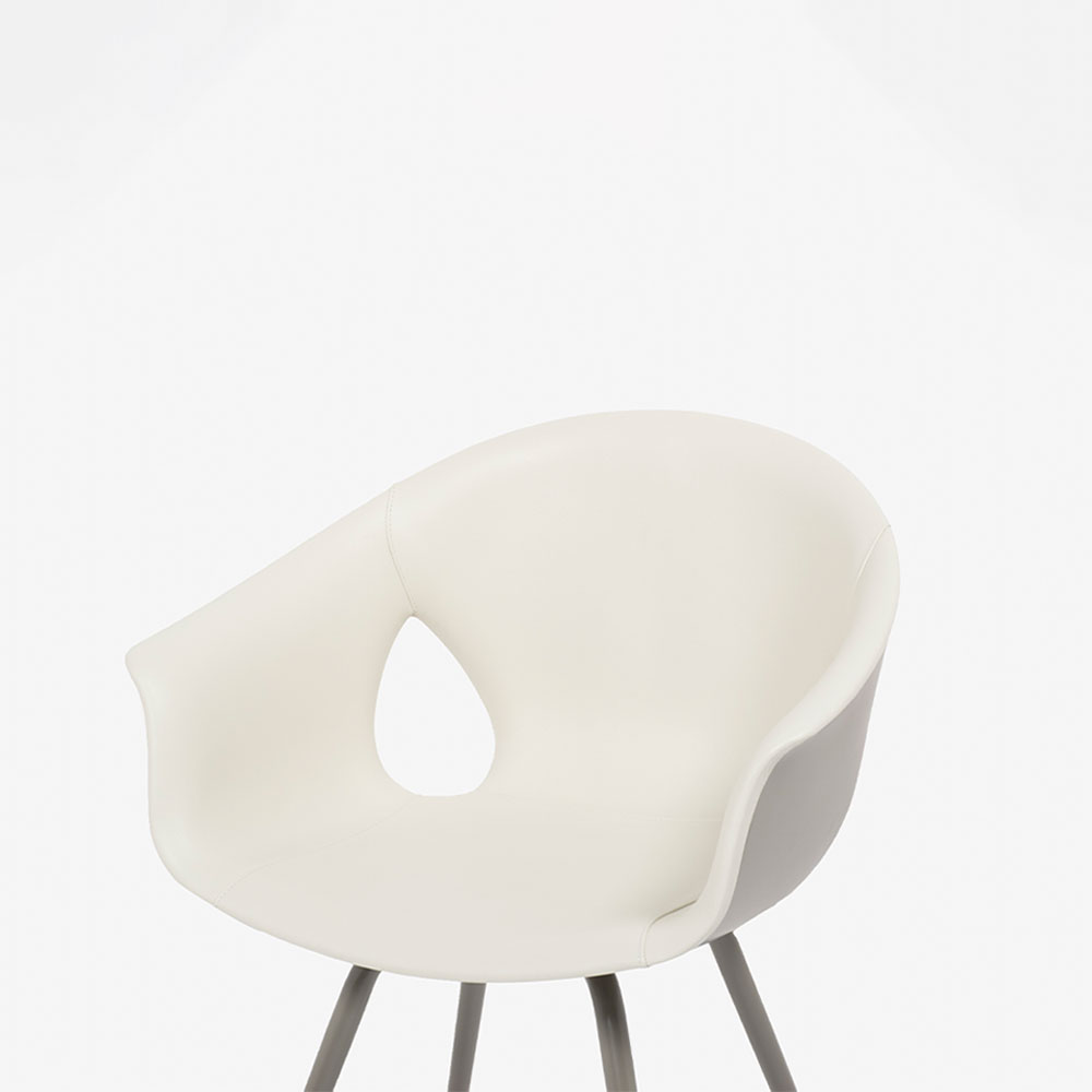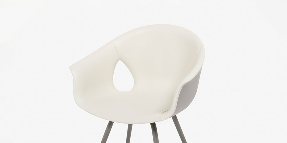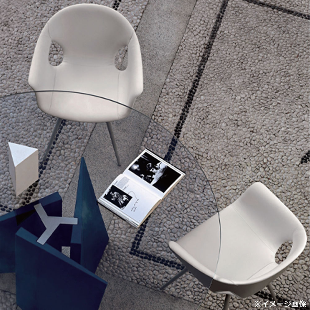 内側のシート部分にはポルトローナ・フラウが誇るセミアニリン染めの上質な革PelleFrau®ColorSphere®が張られています。外側と脚部はシェル型のフレームとスチール脚でできており、異素材ミックスのデザインが上質で洗練された印象です。