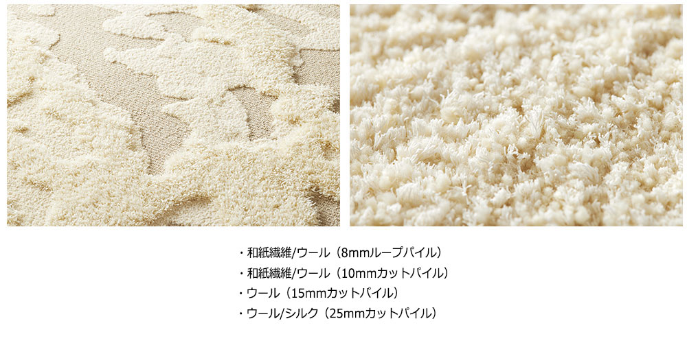 江戸時代から伝わる和紙を張り合わせた敷物「油団(ゆとん)」から着想を得た、「和紙」を素材に活用した絨毯です。和紙の撚り糸である「紙糸」に、生成りの羊毛とシルクを掛け合わせ、4層の長短によって構成された毛足が、豊かな触覚を生活の足元にもたらします。天然素材の柔らかい風合いや佇まいが、空間に優しく溶け込みます。和紙特有のさらっとしたシャリ感が心地よい絨毯です。