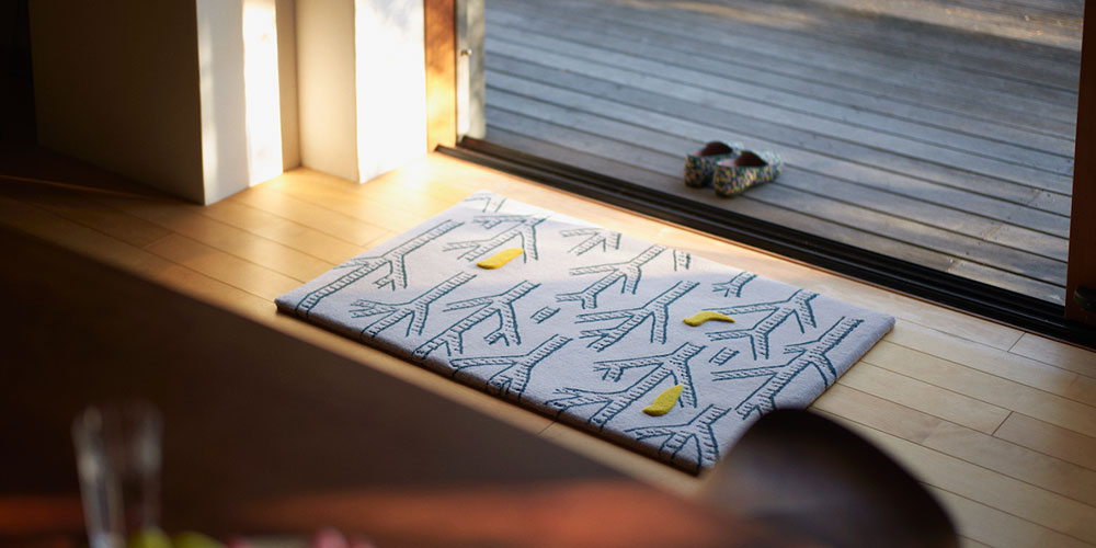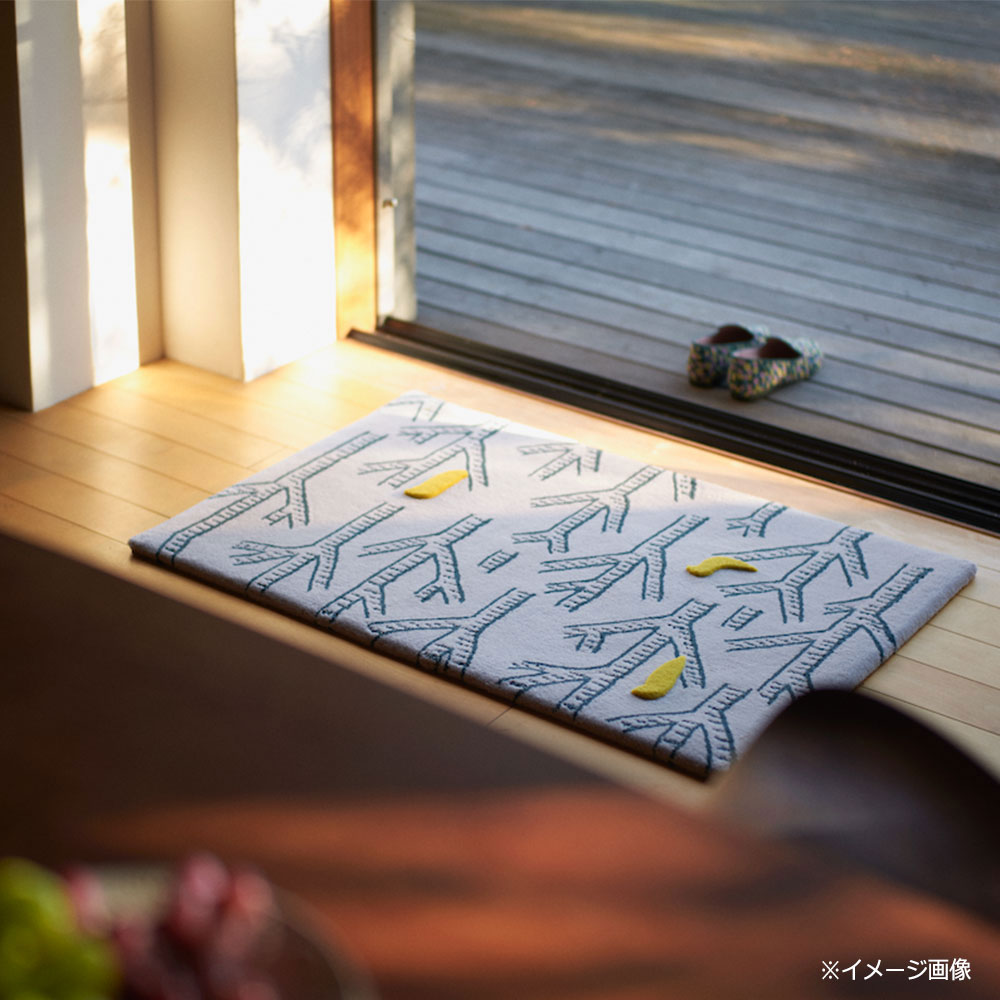 穏やかな森の中、静かにさえずる小鳥たち。空想の森の景色を表現した手刺緞通です。1羽1羽、職人の手仕事によってエンボス仕上げが施された小鳥たちは、暮らしの中で触れられ、月日を重ねていくことで、それぞれの姿と表情へ変化してゆきます。