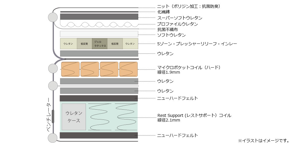 様々な質感のウレタンフォームの多層構造が特徴です。レストサポートコイルに加えて、薄型のマイクロポケットコイルをクッション層を入れることで、細かな荷重の変化に対応し、身体へのフィット感を高めています。