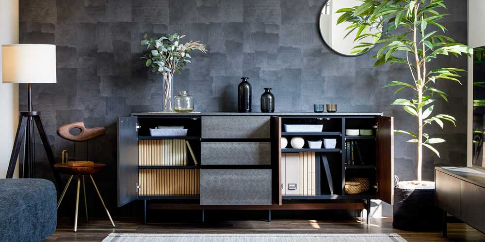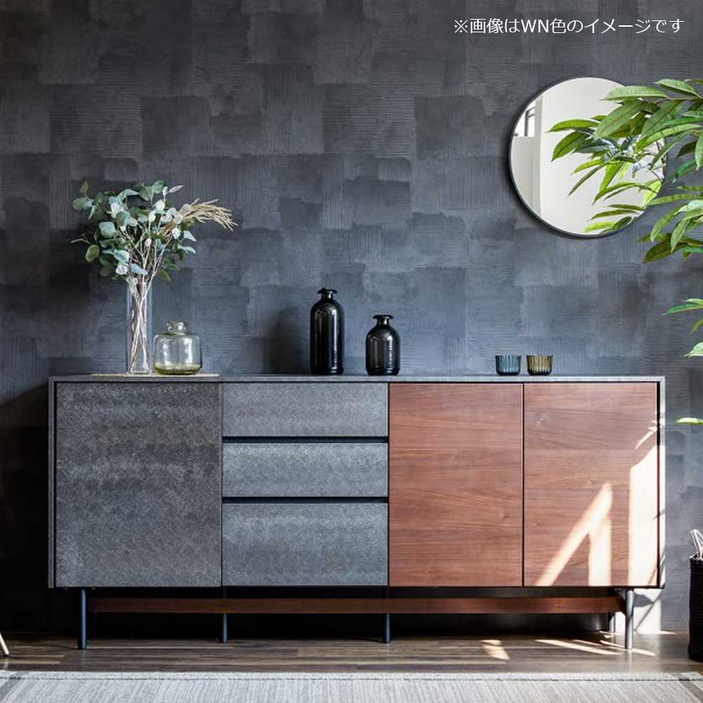 天板・側板・一部の前板は職人が何度も重ね塗りを繰り返す塗装を施し、あえてムラ感を残した仕上げです。手作業の為1点1点模様が異なります。トレンド感あふれる唯一無二のモダンボードシリーズです。※画像は「180Nサイドボード」のイメージです。