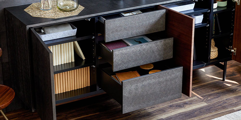 引出収納に加え、扉内は収納物の幅・高さに合わせた豊富な収納スペースに可動棚を完備。可動棚は3cmピッチで高さ調整できるので、無駄なく収納できます。 また、ルーターなども収納できるよう壁板に配線孔も設けています。※画像は「180Nサイドボード」のイメージです。