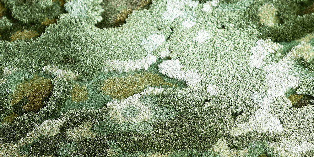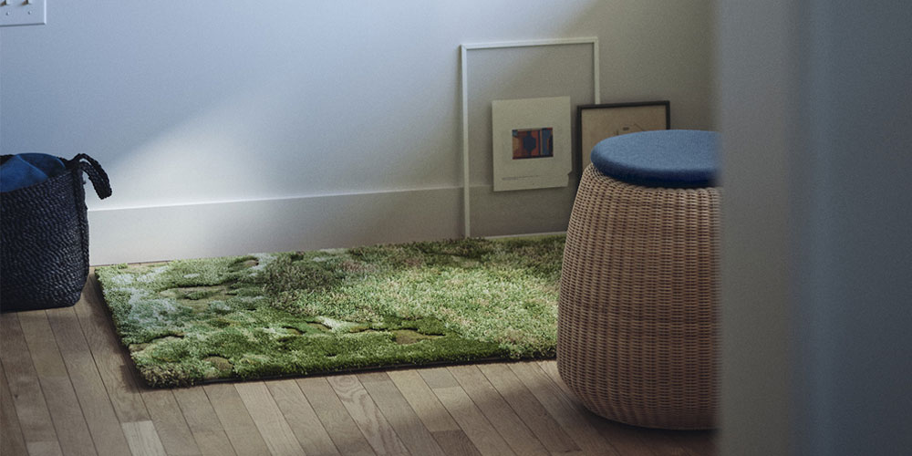 苔の持つ独特で繊細なテクスチャを、ウールとシルクの素材感、毛足の長さに細やかに変化をつける立体的な仕上げによって表現した手刺緞通です。一面に広がる艶やかな苔は、空間に奥ゆかしい日本の自然風景や情景をもたらします。