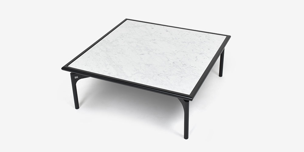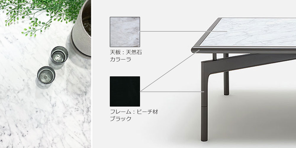 ホワイトの石目が美しい天然石カラーラの天板を、ブラック色のビーチ材フレームで縁取りした高級感のあるデザイン。 天然石の質感がリビングコーディネートの魅力的なアクセントになります。※画像はイメージです。天然素材の為、石目や色味は一点ごとに異なります。