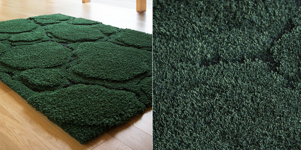 森の樹木が繁り立つ自然の豊かさを、ダークグリーンの色彩と三層の羊毛による立体的なテクスチャで表現しています。撚りの強いフリーズウールによる素朴なテクスチャと佇まいが、空間に生き生きとした情景をもたらします。