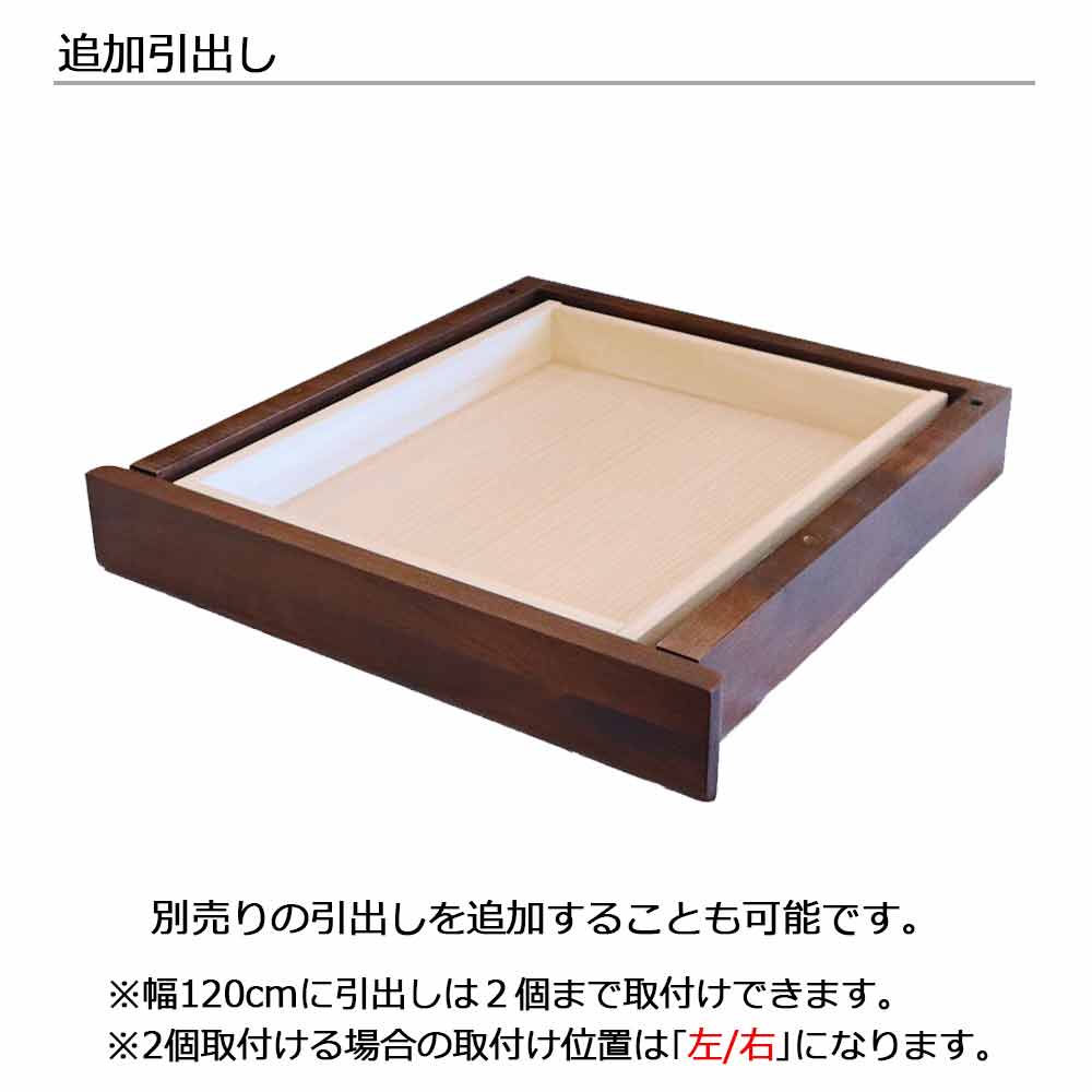 別売りの引出しを追加することができます。幅120cmは付属の引出し以外に1個追加が可能です。引出しを2個取付ける場合の取付け位置は「左/右」になります。