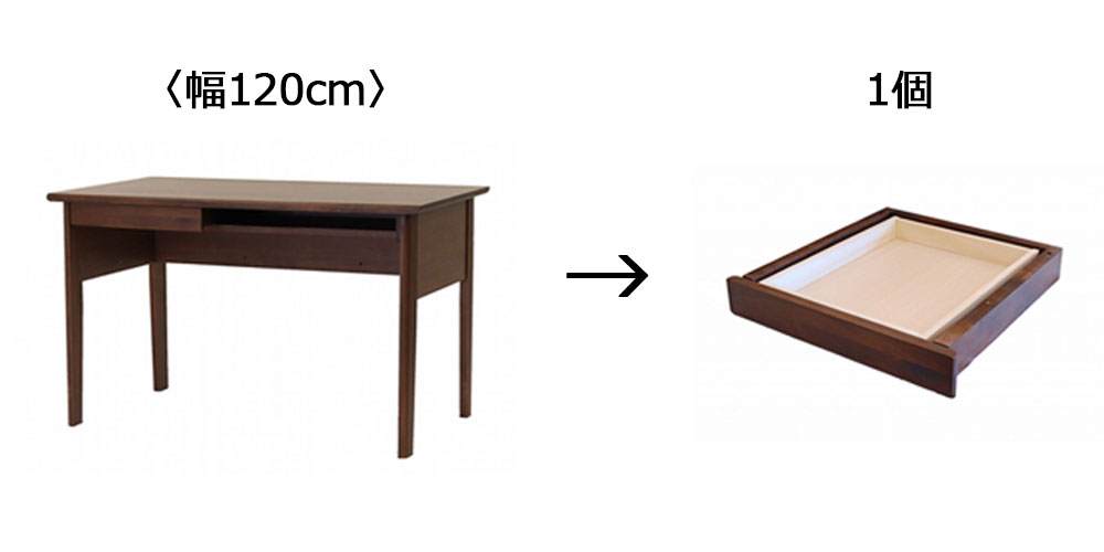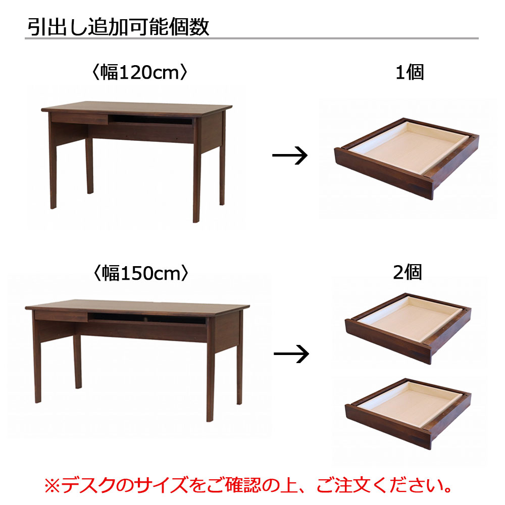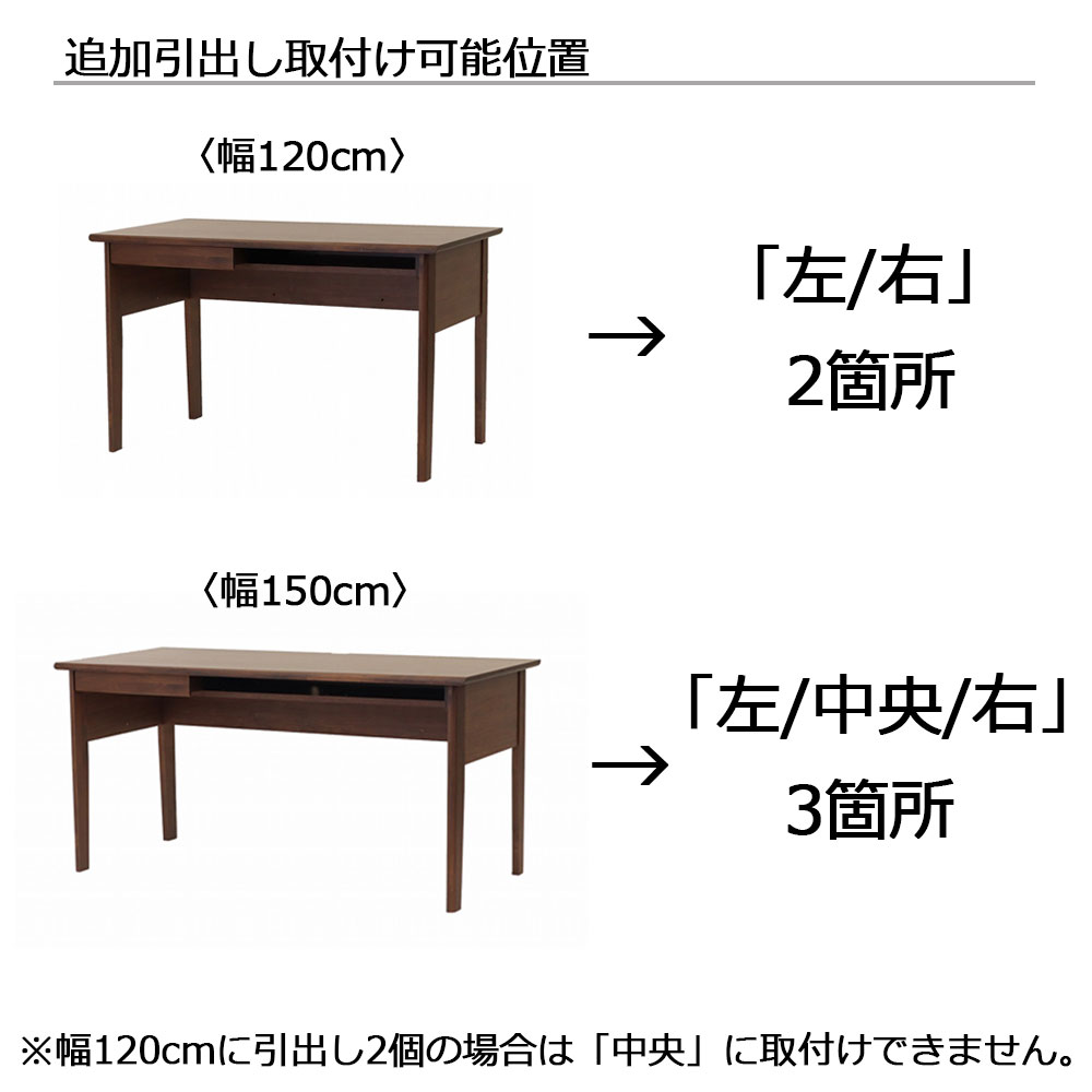 デスク「アーク616 PL」幅120cmは引出しを2個まで取付けできます。デスク本体に引出しは1個付属しますので、引出しは1個追加可能です。取付け可能位置は「左/右」の2箇所です。
